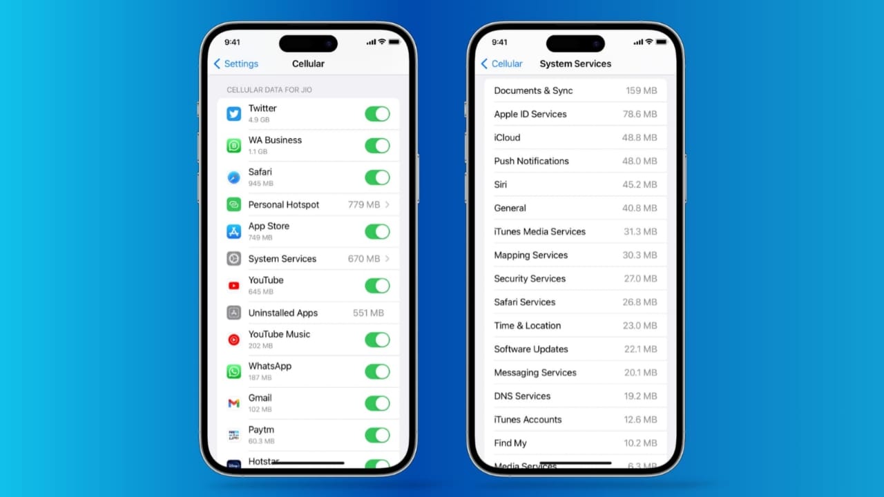 You can disable data for specific apps if needed. Tap ‘System Services’ to check iOS data usage. This includes updates and notifications data. Reset the statistics to track new usage.